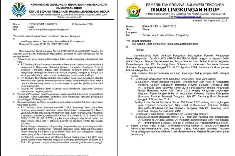 Surat tersebut berbunyi “Menindaklanjuti hasil Verifikasi Pengaduan berdasarkan Formulir Pengaduan Nomor Registrasi: 08/ADU-LH/DLHPROV.SULTRA/VIII/2025 tanggal 14 Agustus 2025 terkait Dugaan Adanya Pencemaran Air Sungai dan Air Laut Akibat Aktivitas Kegiatan Penambangan oleh PT. Tambang Bumi Sulawesi di Kabupaten Bombana Provinsi Sulawesi Tenggara pada tanggal 25 sampai 28 Agustus 2024 bersama ini disampaikan hal-hal sebagai berikut: