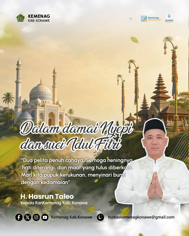 Dalam pesannya, Kepala Kantor Kementerian Agama Kabupaten Konawe H. Hasrun Taleo menyampaikan bahwa Nyepi dan Idulfitri memiliki makna mendalam yang tidak hanya berkaitan dengan ibadah, tetapi juga dengan pembinaan karakter dan kehidupan sosial masyarakat.
